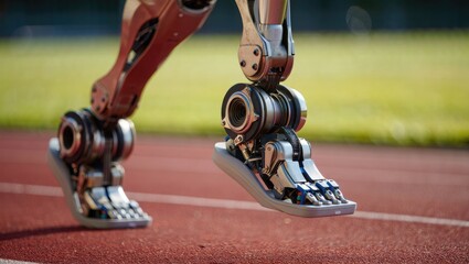 Advanced Prosthetic Legs Running Mid Strides on Red Track for Athletic Performance