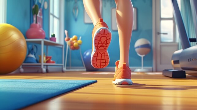 Woman Running on Treadmill in Bright Home Gym During a Morning Workout Session