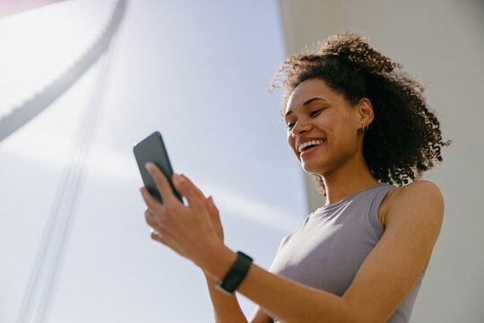 Smiling woman athlete in sportswear standing outdoors after training and use mobile phone