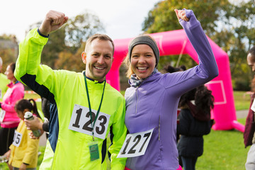 Enthusiastic runner couple cheering at charity run in park