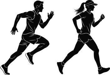 Running man and woman silhouettes, jogging and sprinting poses, sports fitness vector illustration for exercise, training, athletics, and healthy lifestyle concepts