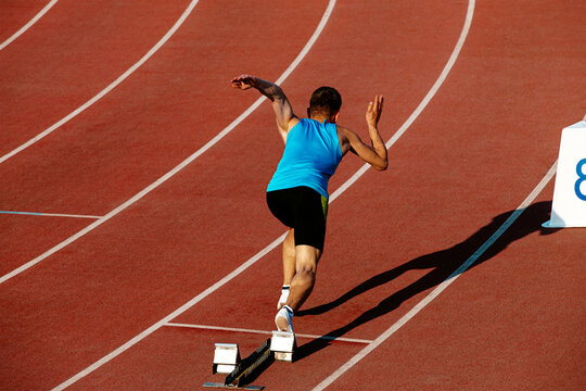 Back of man start running race for sports, action and speed on stadium, arena and competition. Male athlete, runner and ready to sprint for fitness, fast training and cardio performance at track line
