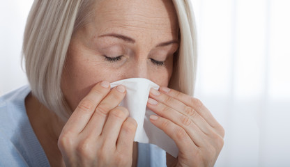 Healthcare, cold, allergy and people concept, sick woman blowing her runny nose in paper tissue on white background