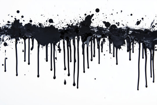 black ink drips, splashes and splatters, horizontal with long drips, on white, isolated with long runny drips and droplets