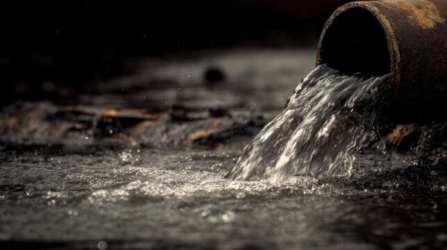 Contaminated water spills from a rusty pipe into a nearby stream, threatening wildlife and plant life with pollution