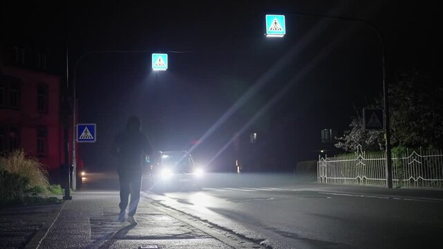 A man runs down the street and drops his mobile phone. during nighttime in an urban city environment
