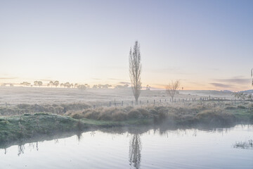 A peaceful rural scene with cows and calves grazing in a meadow, bathed in the warm glow of the summer sun, symbolizing the simplicity of farm life