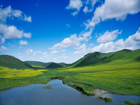 Idyllic mountain landscape with fresh green meadows and blooming wildflowers. Idyllic nature countryside view, rural outdoor natural view. idyllic banner nature, panoramic spring summer scenery