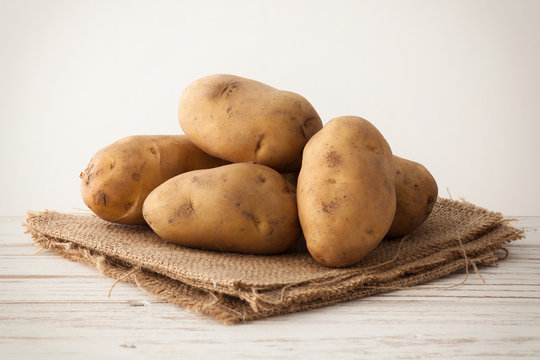 A top view image of large organic russet potatoes on a brown burlap sack.