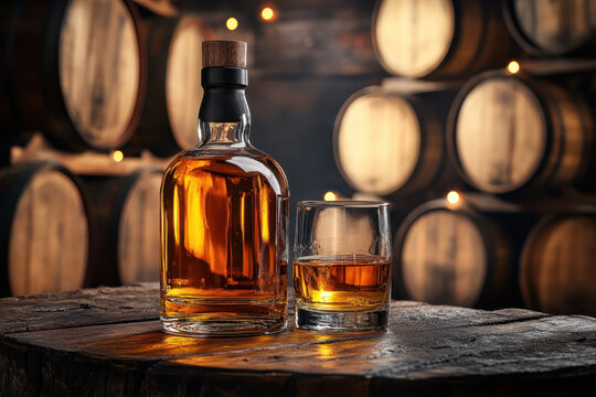 Whiskey bottle and glass on wooden table, with barrels in background.