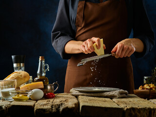 The chef grates the cheese for the Caesar salad. Salad ingredients. Close-up. Cooking process. Restaurant, cafe, advertisement, banner, poster. Home kitchen.