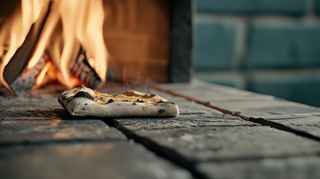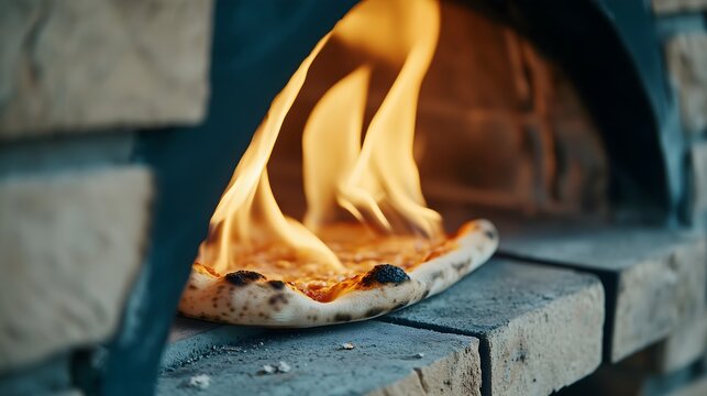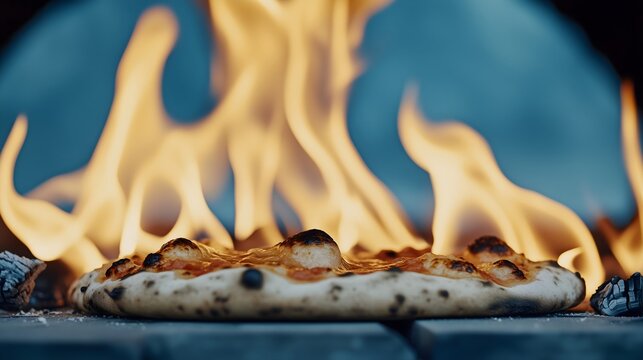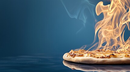 Flaming pizza cooking in blue professional oven with intense fire. culinary with orange flames. Wood-fired cooking concept. Restaurant, food service content. Horizontal banner