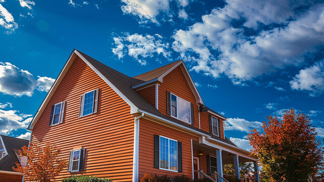 A rustic terracotta-colored house with siding and shutters exudes a timeless charm in the suburban setting, blending earthy tones with the vibrant blue sky above on a sunny day.
