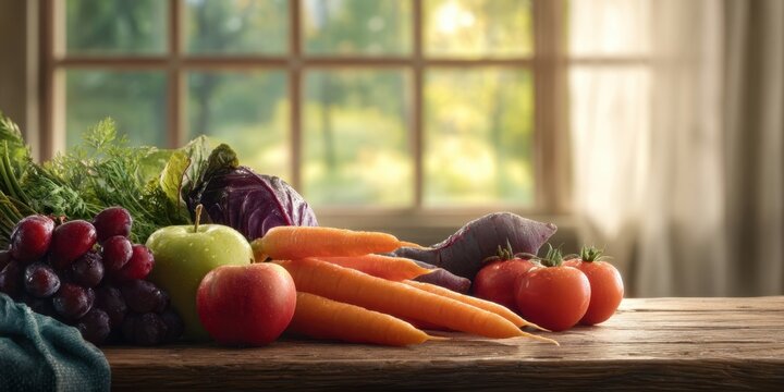 The vibrant arrangement of fresh vegetables and fruits on a wooden table