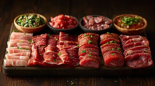 An elegant array of sliced raw beef cuts and garnished sauces is displayed on a dark board, perfect for hot pot, barbecue menus, restaurant advertising, and upscale culinary concepts.