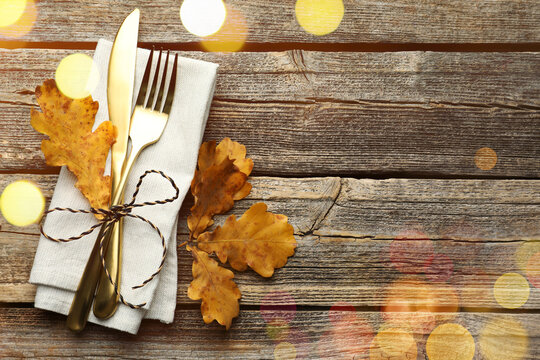 Autumn place setting with cutlery, napkin and golden leaves on wooden table, top view. Bokeh lights