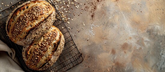 Artisan bread with seeds displayed on a cooking grid against a beige backdrop creating a rustic vibe with copy space image
