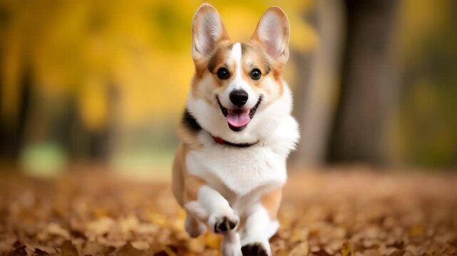 A happy corgi dog bounding playfully through rustling autumn leaves toward a steady tracking camera moving forward in cinematic 4k resolution