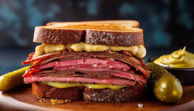 delectable pastrami rye sandwich is main focus showcasing its generous layers thinly sliced pastrami creamy mustard toasted bread few pickle slices rest table beside sandwich