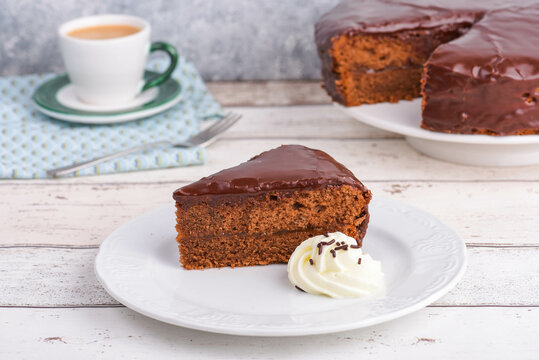The Original Sacher-Torte on table served with white whipping cream, The cake consists of a dense chocolate cake with a thin layer coated in dark chocolate icing on the top, Famous cake in Austria.