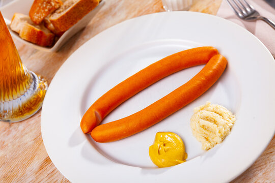 Two delicious thin parboiled sacher sausages traditionally served as beer snack with horseradish and spicy mustard. German cuisine .