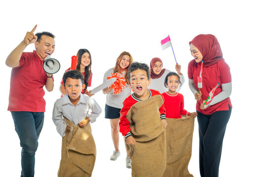 A lively illustration set of Indonesian children playing traditional Independence Day games, such as sack race, cracker-eating contest, and tug of war, for cultural events and festive designs.