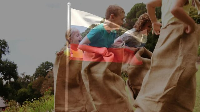 Playful Sack Race: Children of various backgrounds joyfully compete in a sack race, their bodies in mid-air as they leap forward in a lively display of teamwork and amusement.