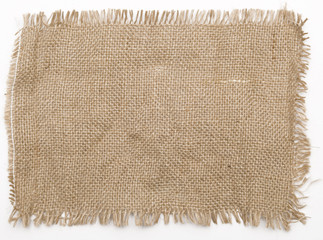 Old burlap fabric napkin, sackcloth on table background. top view with copy space
