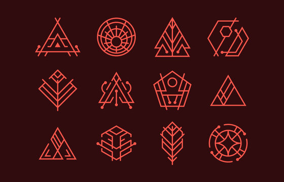 Geometric linear style vector flower logos or emblems set, sacred geometry floral symbols line drawing emblems collection, blossoming flower hotel or boutique or jewelry logotypes.