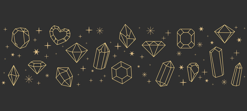 Magic crystal sacred geometry polyhedron celestial esoteric seamless border with gold line gemstone stars, moon decorations. Elegant outline stones.