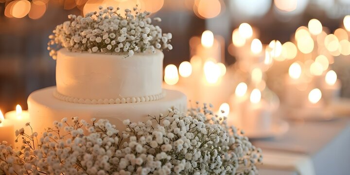 White flowers adorn wedding cake with candles in background at celebration. Concept Wedding cake, White flowers, Candles, Celebration, Special occasion