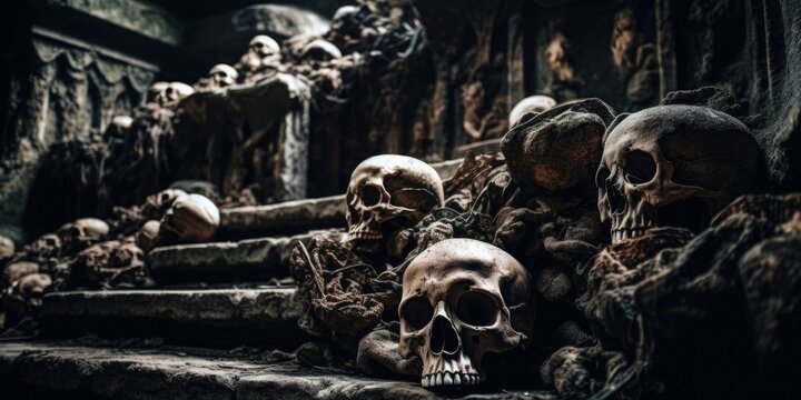 Skeletal remains strewn all over ancient decaying castle stone steps, broken and shattered sacrificed human skulls, scary macabre scene - generative AI