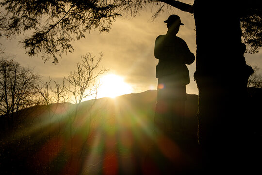 Double exposure of Silhouette of a solider and the sunset or the sunrise against Israel flag. Concept - armed forces of Israel.