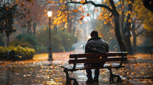 A person sitting on a bench in the rain. Suitable for depicting solitude or contemplation.