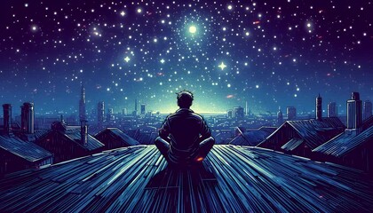 Lofi sad boy anime cartoon sitting on a rooftop. Lofi Loop Motion Background Cover