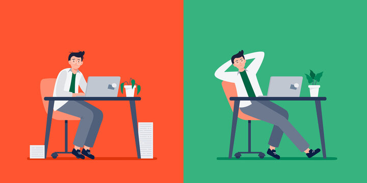 Low energy and high energy comparison. A businessman in a tired and energetic state. A man successful doing his work. Frustrated male worker feeling overwhelmed. Vector flat illustration.
