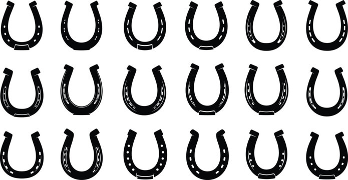 Black horseshoe silhouettes for luck symbol, metal shoe icons, equestrian equipment collection, western farm design, vector illustration, isolated shapes