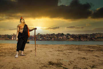 An Indian Hindu Sadhu (saint) on the banks of holy river of Ganges and Varanasi city in the background, Varanasi, Uttar Pradesh, India