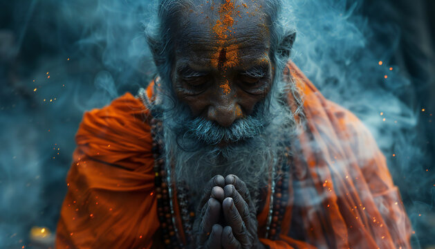 Indian sadhu monk meditating in temple. Religious prayer man. Person sit in lotus pose and pray. Zen yoga practice. Peaceful beauty. Spiritual asana.