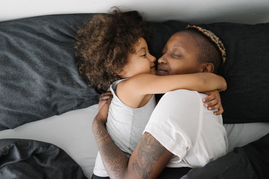 Mother hugging daughter
