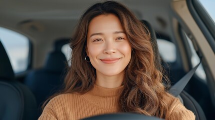 Portrait of a smiling young woman in the driver’s seat of a car, exuding warmth and confidence, advertising or editorial automotive use