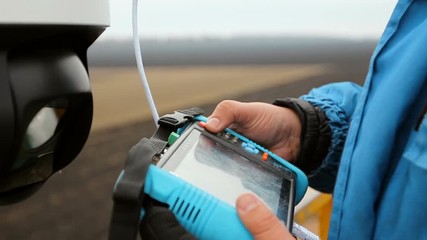 An electrician man repairs installs a video surveillance system. Using PC tester