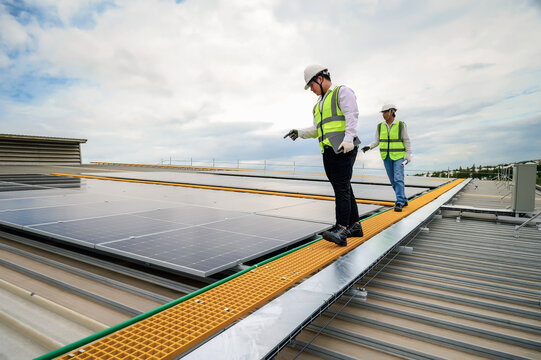 Engineer Team Inspector Quality in Solar Roof Panel Installation, Quality Control in Work of Sustainable Photovoltaic Installation on Factory Roof Buildings.