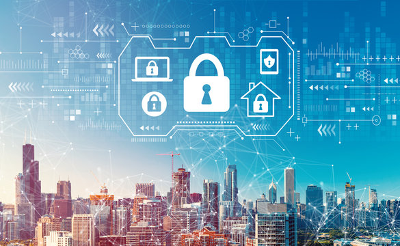 Security theme with downtown Chicago cityscape skyscrapers