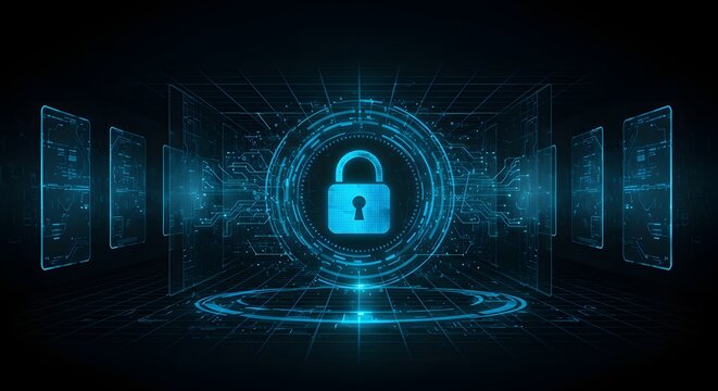Enhancing digital security lock icon graphic design in a tech-themed environment