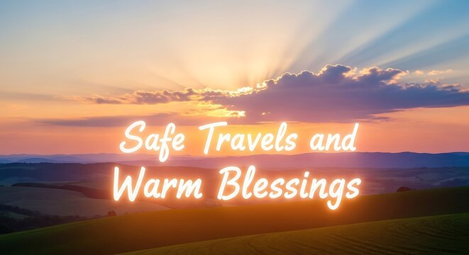 Road stretches into the distance with message for safe travels on a cloudy day in a rural landscape