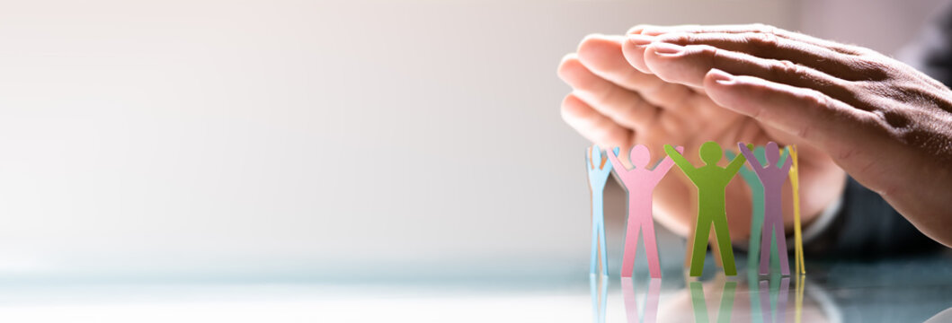 A paper cutout family on two hands against a teal background, symbolizing family care and protection. Generative AI