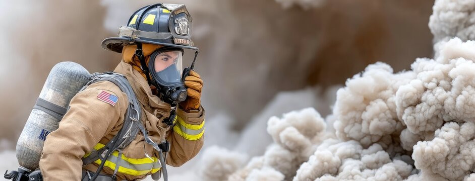 Firefighter communicating through a walkie-talkie amidst a smoke-filled environment during a rescue operation at a disaster site