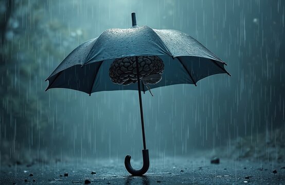 Artistic image umbrella design with brain inside. Conceptual art depicts idea of protection from challenges. Rain, weather, nature, mind protection concept, thought, brain health, mental health.