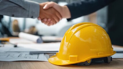 Deal and Construction: A firm handshake sealed over a table, with a yellow helmet signifies agreement, commitment, and partnership.